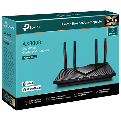 Enjoy smooth and fast connectivity with the TP-Link Archer AX55 AX3000 dual-band Wi-Fi 6 (802.11ax) router. Offering speeds up to 3000 Mbps, this dual-band network at 2.4GHz and 5GHz frequencies has OFDMA technology that optimises speed for all connected devices. It is compatible with Amazon Alexa via voice commands for all your smart home duties.